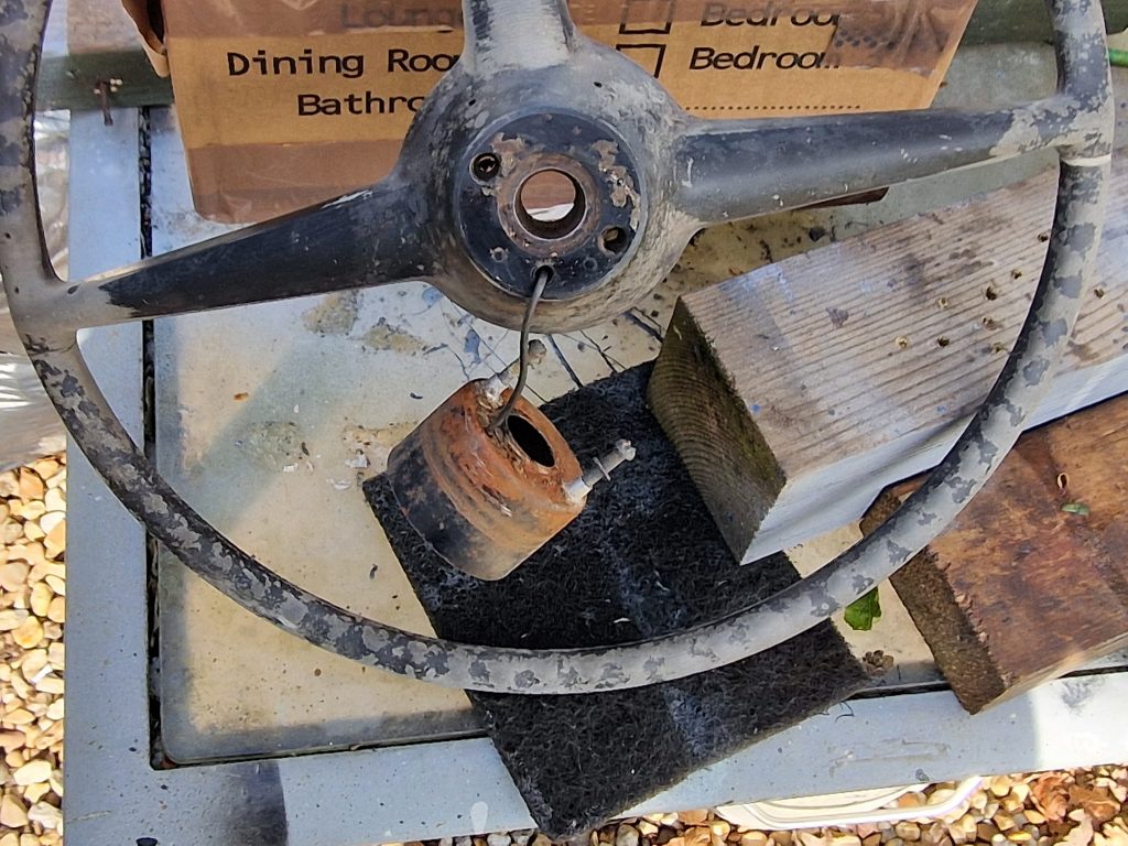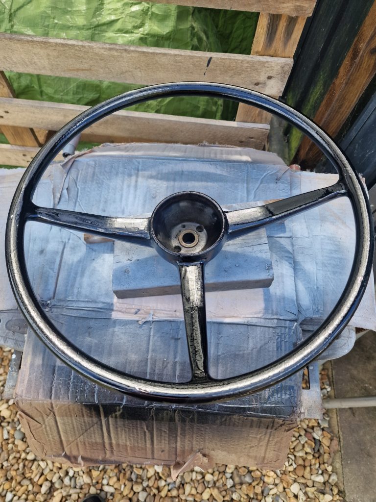 OK, so the steering wheel!! I started to clean it up and found some ominous looking cracks. I’m getting a little tired of spending money on this thing now, so set about a repair. Cut out the cracks, mixed up some JB Weld, filled them, rubbed them down and then painted the whole thing. I used a gloss black plastic paint, and then did a couple coats of lacquer. Also there is not much shiny stuff on a Land Rover, only yer headlight surrounds and the steering wheel center. So thought I would get them properly shinnied up! (re-chromed!). Waiting for them to come back