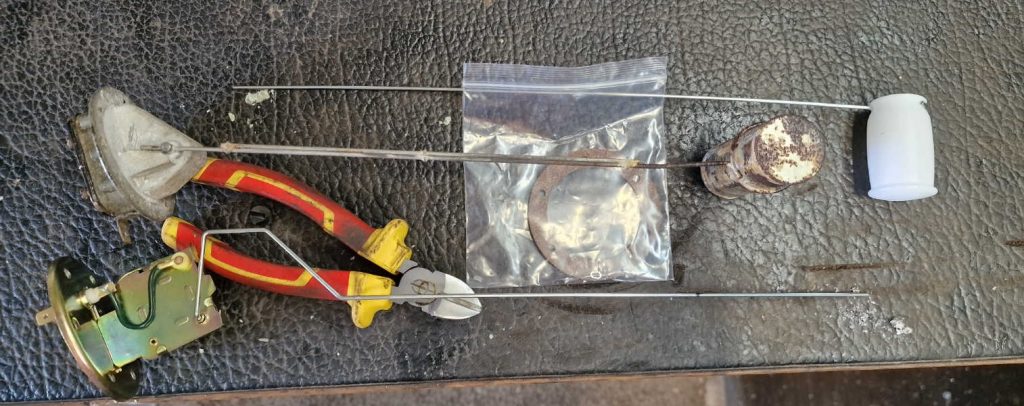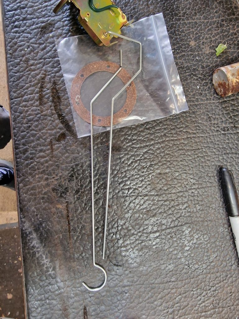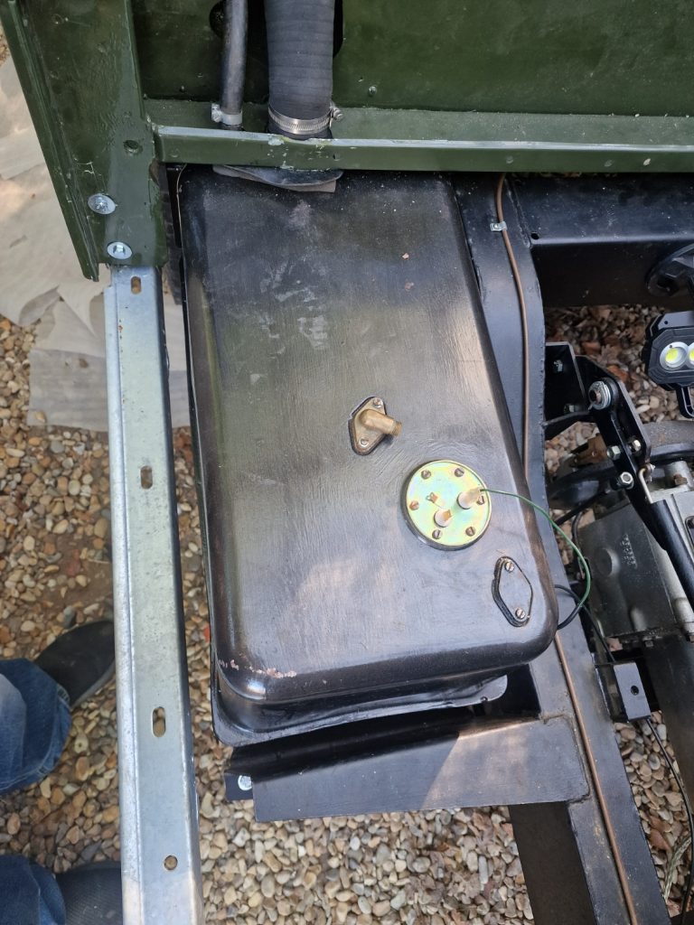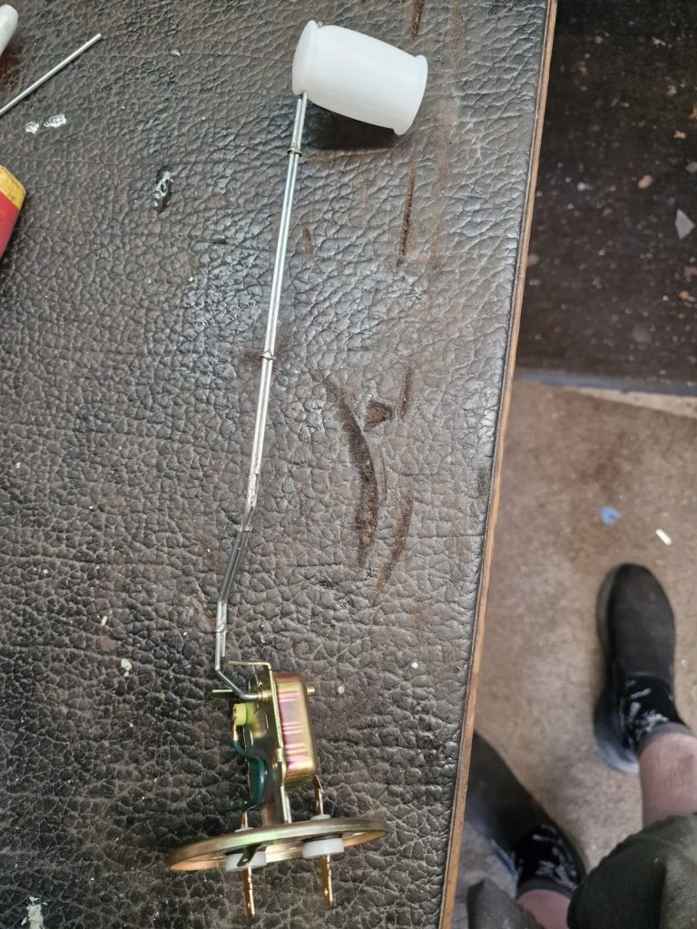 Something else hanging around was the petrol tank. My painting was not great first time around, so had taken it out cleaned it up and re-painted it again. But more importantly I had tried to save the petrol sender, the bit that shows me how much fuel is in the tank If you think about your toilet, its a little like the bit in the systern, its a floaty thing, that goes up and down with the petrol, sending a signal to the petrol guage. Anyway, the original one was not reliable so I bought a replacement.