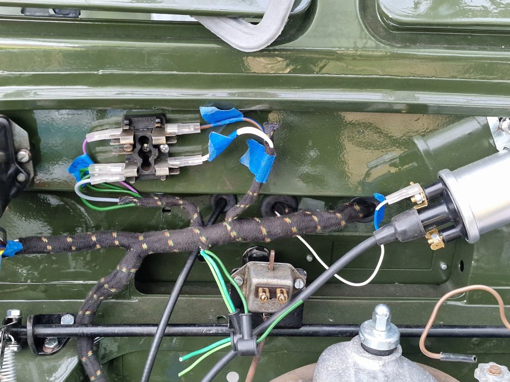 I had done a little bit of this before, but thought, now’s the time to start fitting the harness (or loom) whichever term you want to use. I fitted the Voltage regulator, fuse box (for what it is!) and coil before, so obvious next step, feed the harness through the two holes in the bulkhead. Easy Hu! especially as I bought a rather expensive EXACT replica of a 1965 series 2a bulkhead, well no. One hole was perfect, the second, there is no way the loom will go through that! So I went to my old bulkhead to check, ands sure enough, 1 hole is larger than the other. So the bulkhead is not exact…. and what really pissed me off again, I had to enlarge the hole, ruining the e-coat, and exposing bare metal. I did paint the hole (well not the hole, thats impossible, the edge of the new hole!).