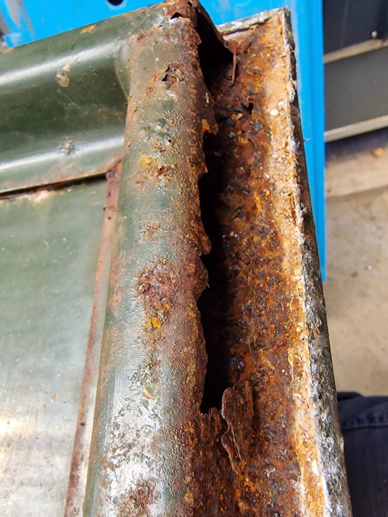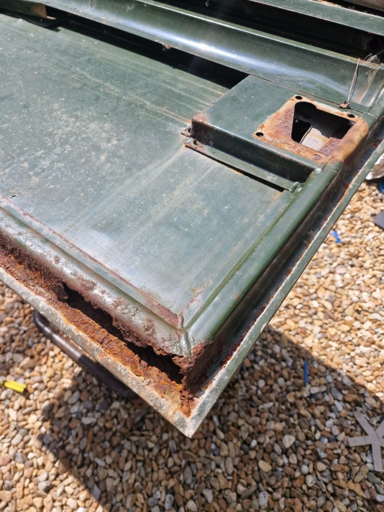 first part to look at was the doors. there was two challenges here, a smallish dent in one of the doors, and the door frames of both doors rotted out at the bottom.