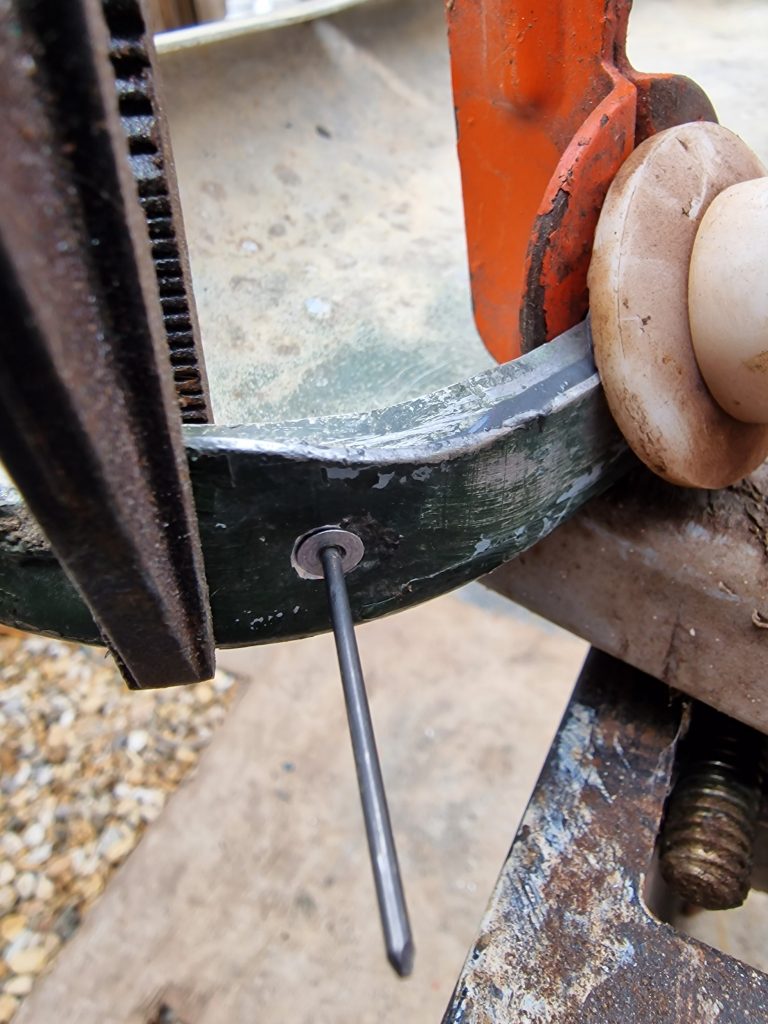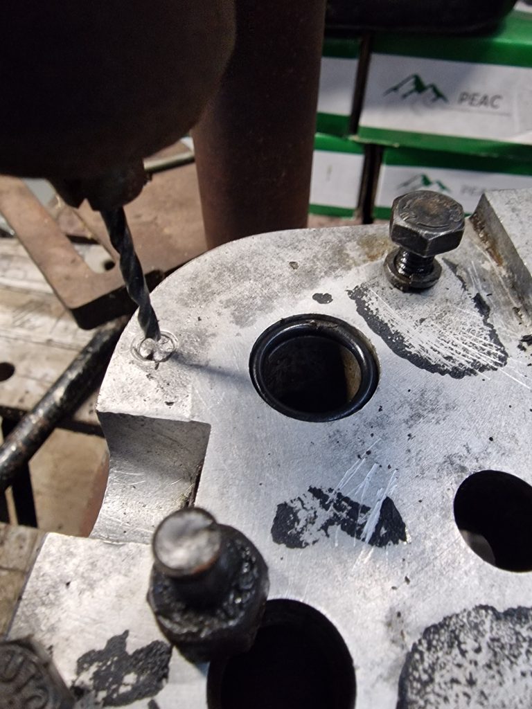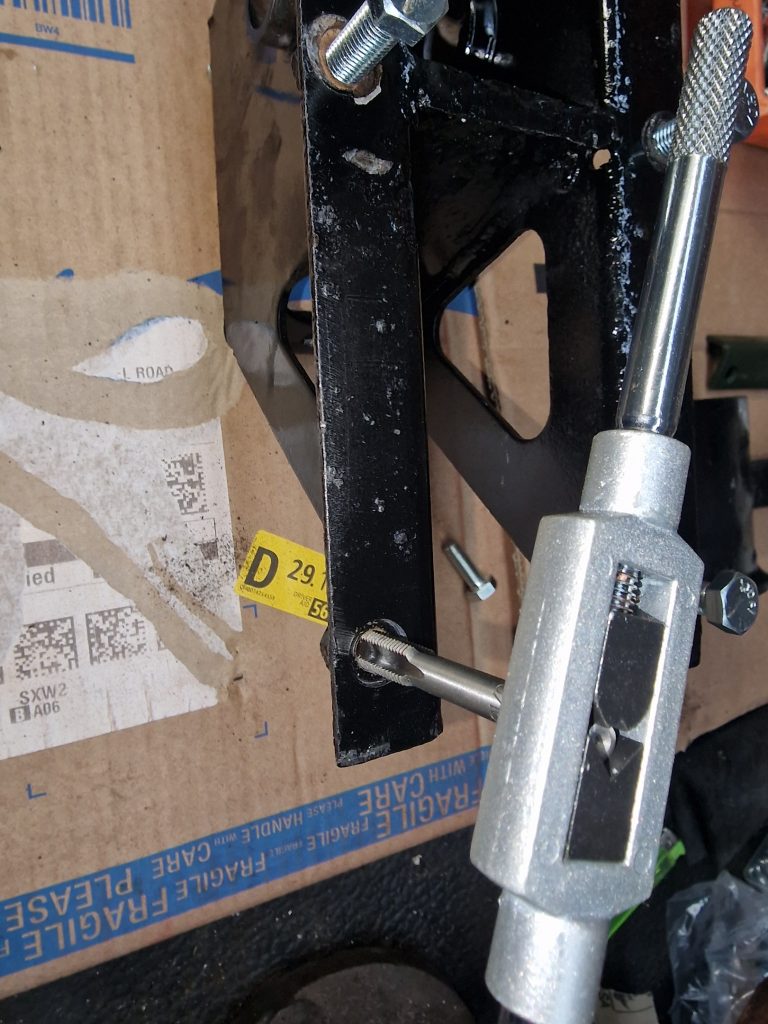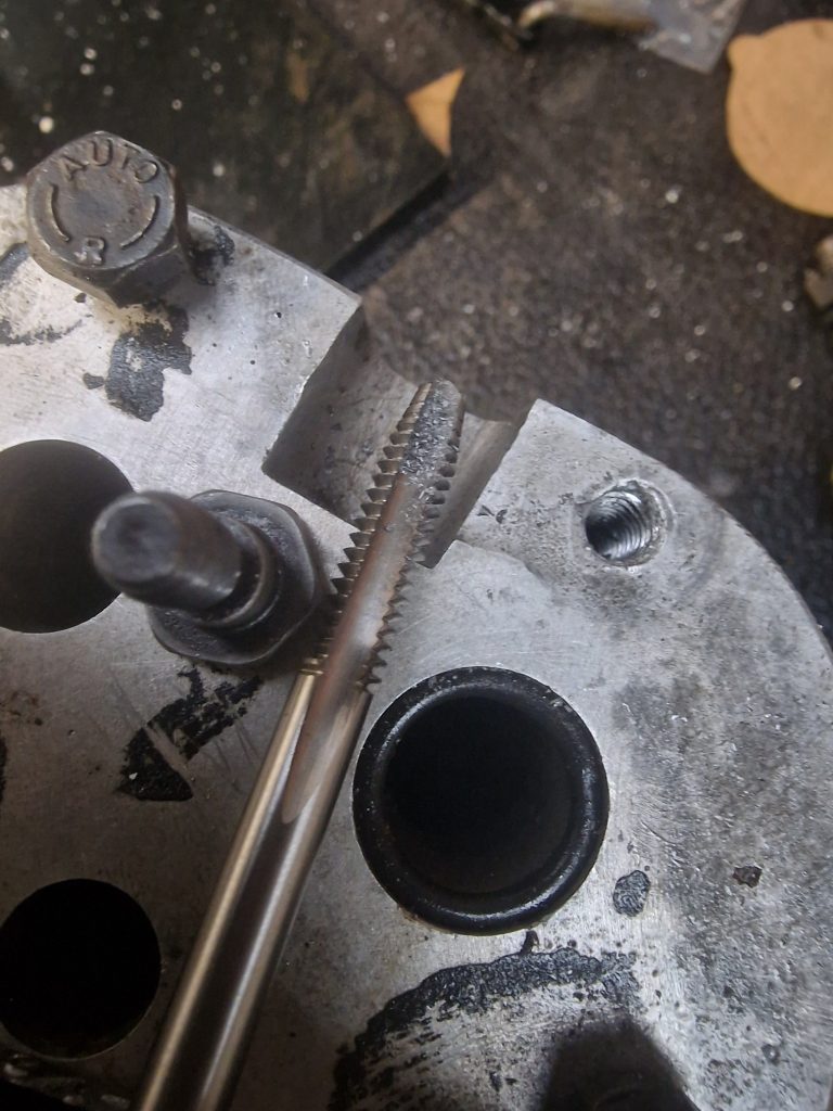 Next option was to drill the old bolt out and re-tap it. By this time I had the new bolt which just happened to have 1/4″ Whitworth thread. Oh crap, another new tool needed.