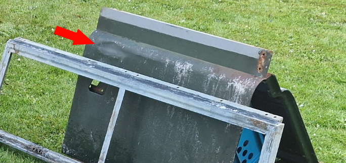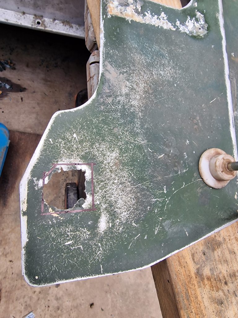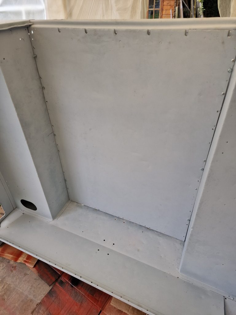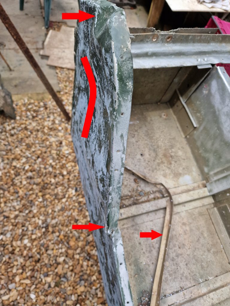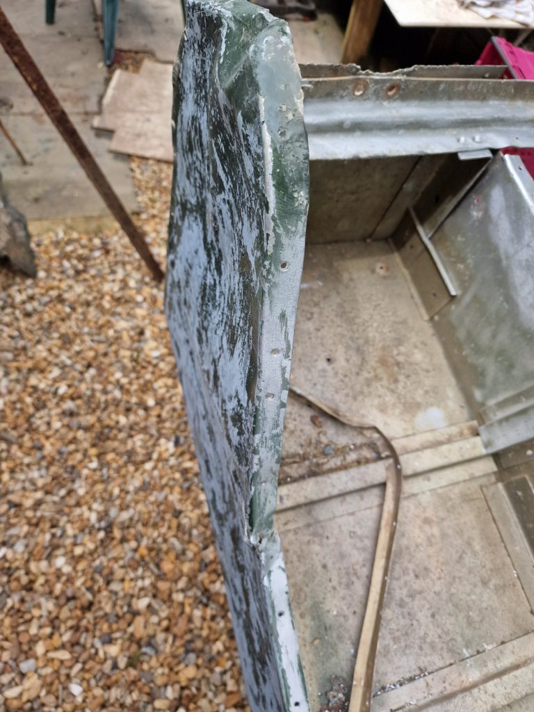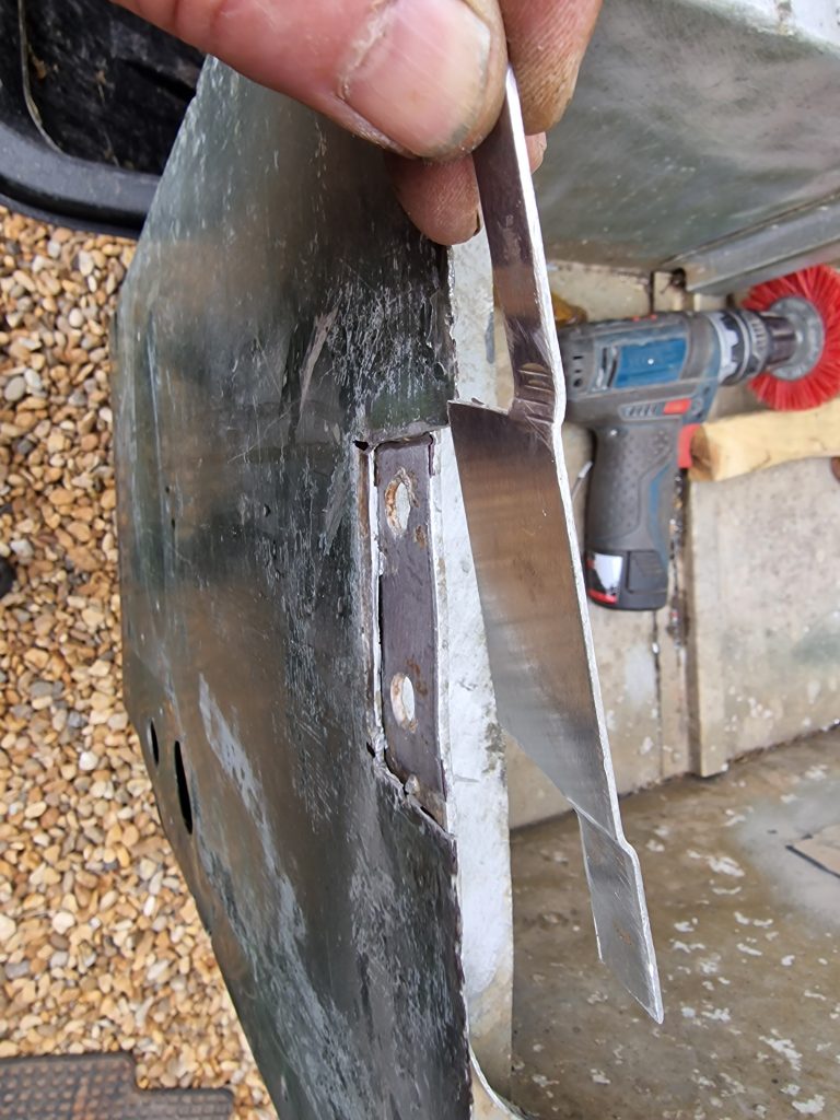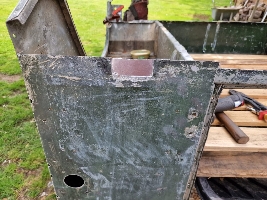 In the top part of the first image, you can see the damage, the bottom half of the image my “suspect” attempt at panel beating. Its along way from perfect, but it now resembles the shape it should be. The process for PB is not entirely straight forward. The Birmabright work hardens, so the more you work it, the more brittle it becomes, so needs to be annealed often, which means heating it up and allowing it to cool, beat some more and repeat. I could keep going with this but took the view I am more likely to make it worse rather than improve it significantly. The second and third images shows the re-enforcing bit, which had become bent and detached from the panel. This was re-shaped, spot welds drilled out and again, using JB-Weld and countersunk pop rivets re-attached.