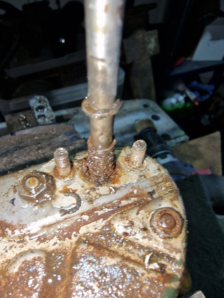 The image on the left shows the pin (Holes) and on the right the shaft being pressed out, using sockets and upside down bolt to press it all the way out.