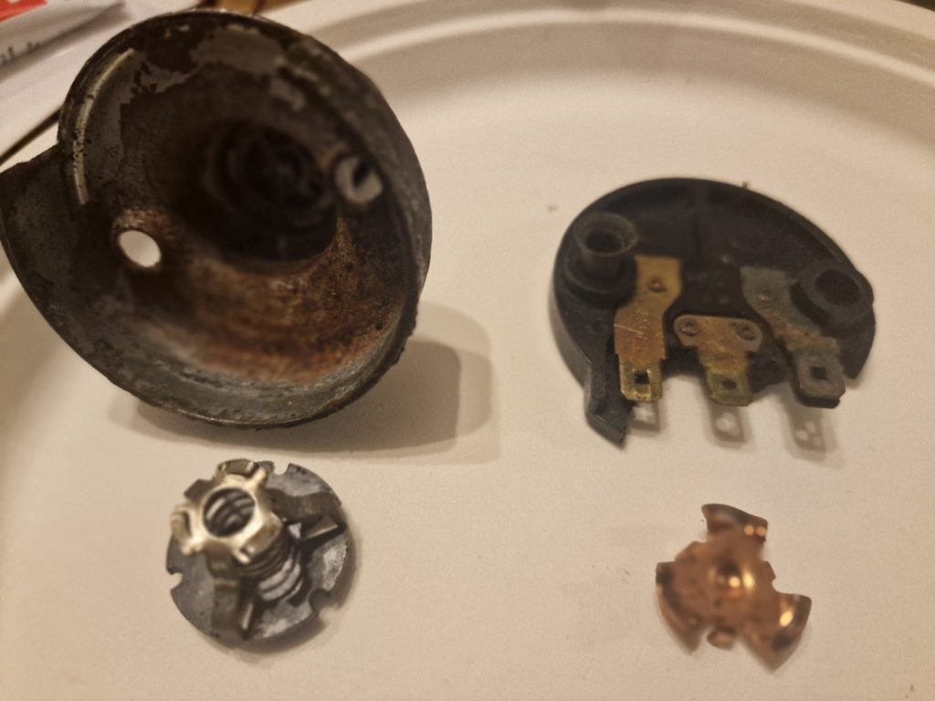 This switch was not really working very well, and wanted it cleaned up in any case so I set about, rather roughly taking it apart. Its much easier to know how to take something apart properly, after you have done it once, and broken it! The black bit, with the connectors on, I broke into many many small pieces.