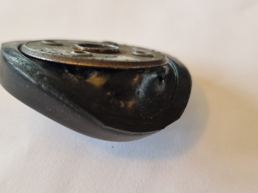 Next, dig out the old rubber wheel, and replace with a new one. Apparently, the way to do this is to drill out the rivets (you can just about see them on the top), separate the two parts, put the new rubber in and use bolts, nuts or screws to re-attach them. I didn’t do that! I cut the rubber wheel, in line with each of the rivets, and gently eased the rubber into the gap. Worked perfectly, with no damage to the actual wheel.