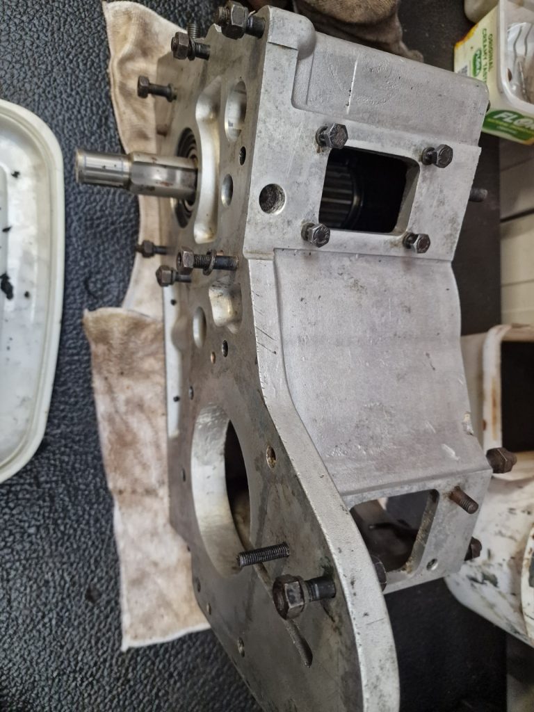 Put the bottom cover plate back on the transfer case, just to keep it safe and all together as this will need to come off later, and the intermediate gear out again when its attached to the main gearbox.