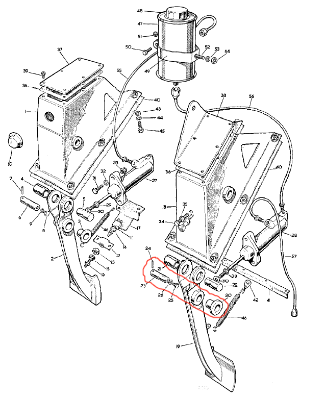 This is the drawing from the parts book. the bits highlighted in red are what holds the pedal in the pedal box. There is a shaft (23) that sits inside two brass bushes (20). the shaft is held in-place with a pin (24) that locates through the shaft and the pedal box.