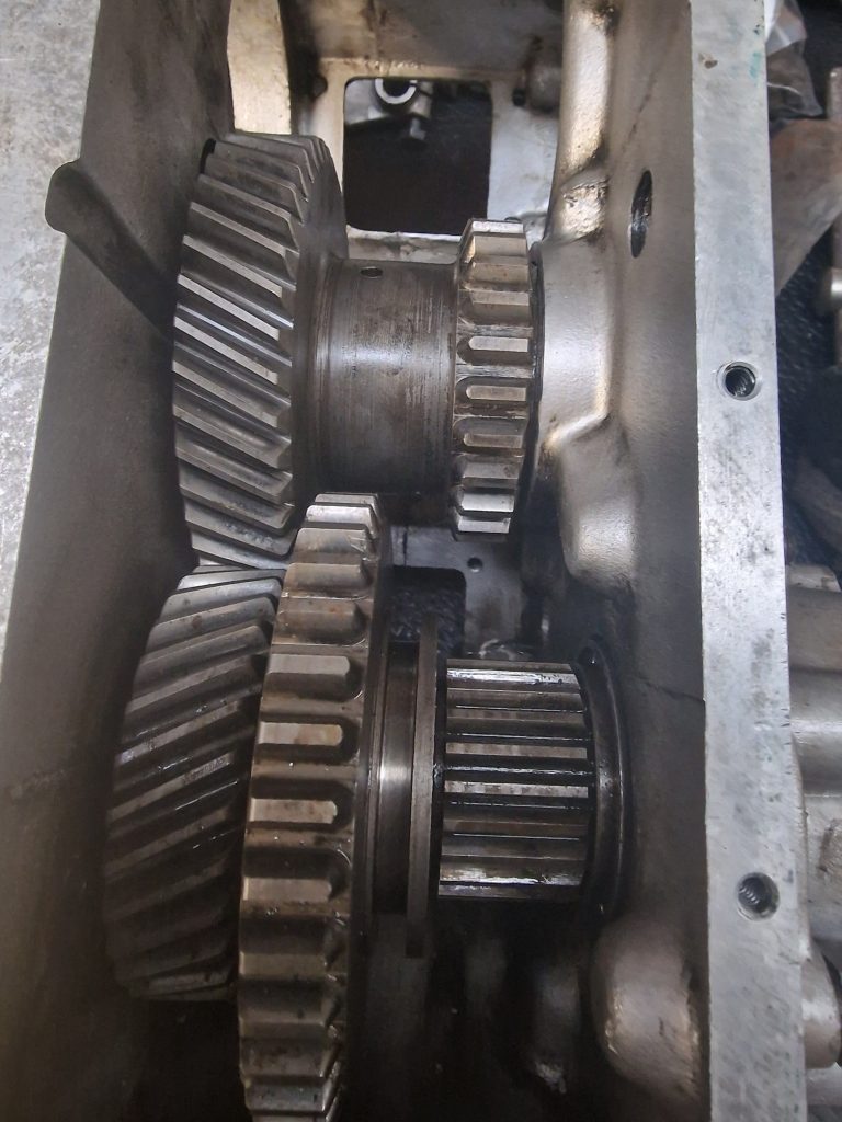 First job is to separate the Main Gearbox from the Transfer Box. To do this, there are a number of bolts on the outside, but also 3 I think, inside the Transfer Box. To get to these, remove the bottom plate (after emptying the Oil), and remove the pin that holds the Intermediate gear in-place. (thats the gear in the picture on the left, in the middle of the box). The inside bolts can now be undone.